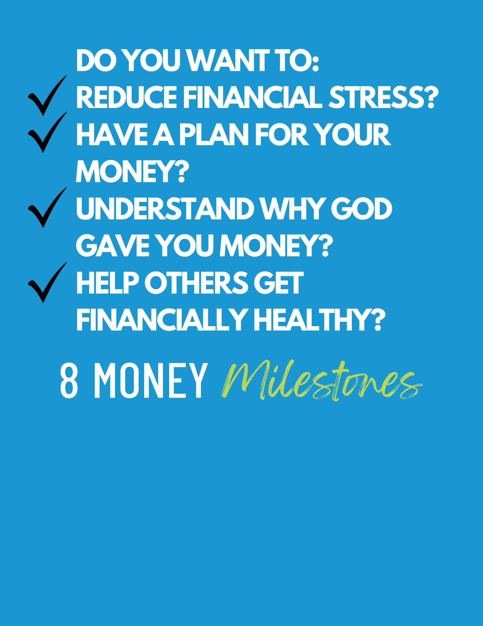 The 8 Money Milestones program is also about deepening our walk with Jesus. As we learn to manage our finances wisely, we become better stewards of the gifts God has given us. This journey will not only lead to financial health but also spiritual growth, drawing us closer to God's heart and His will for our lives. 8 Money Milestones is also an excellent tool for those who feel called to help others with their finances. By participating, you will gain valuable knowledge and skills that you can share with friends, family, and our broader community, extending the impact far beyond your own household.